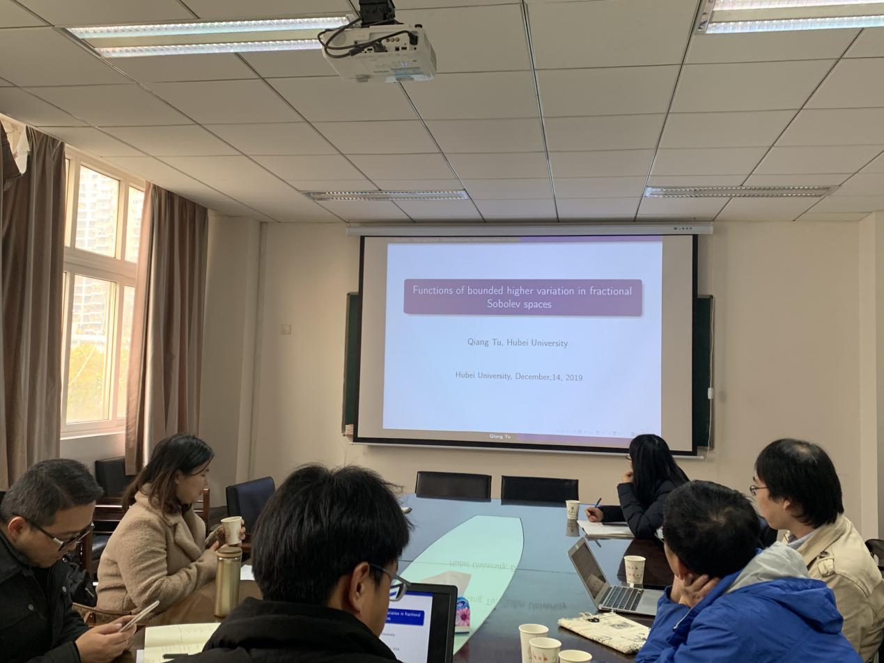 涂强博士的报告题目为“Functions of bounded higher variation in the fractional Sobolev spaces”。报告中,涂强老师介绍了与Functions of bounded higher variation in the fractional Sobolev space相关的一些问题,在分数索博列夫空间的框架下,建立了有界高变分函数的优良性质。参加报告的师生与涂强老师对于一些相关专业的问题展开了细致的交流,开拓了自身眼界。