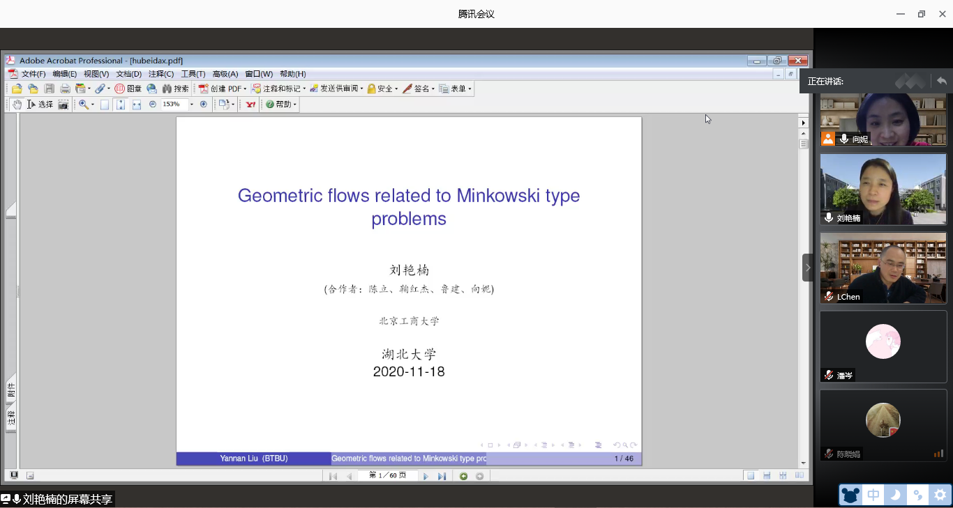 2020年11月18日晚,北京工商大学刘艳楠教授应公司向妮教授邀请,为公司几何团队作线上学术报告,报告通过腾讯会议举行。会议由向妮教授主持,来自公司几何团队的教师、研究生10余人参与了报告的听取和讨论。