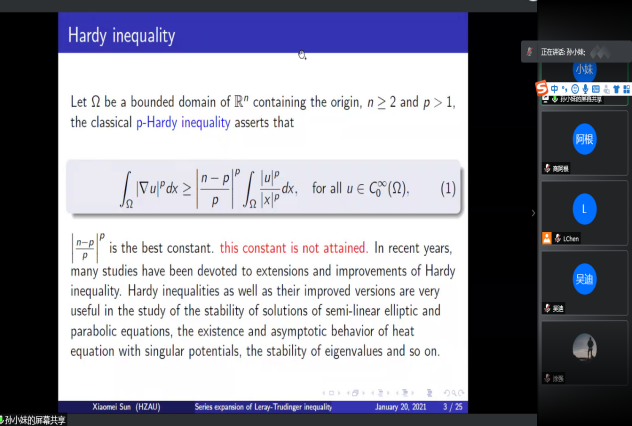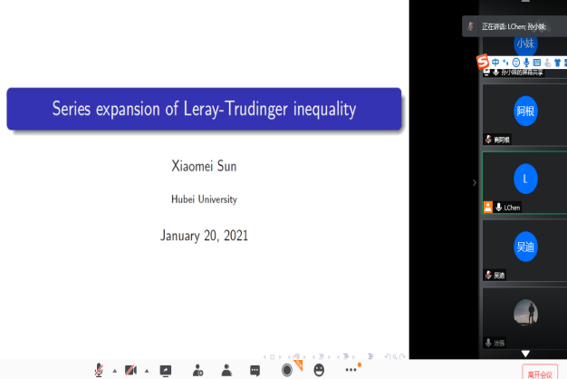 孙小妹教授报告的题目为《Series expansion of Leray-Trudinger inequality》,在这次报告中孙小妹教授给我们建立了一个Leray-Trudinger不等式的无限级数展开,并且这个展开式与Hardy不等式和Moser Trudinger不等式紧密相关的,孙小妹教授这篇文章的结果是对G. Psaradakis, D. Spector and A. Mallick,C. Tintarev的早期结果的一个改进,另外她的这个结果可以看做是对Hardy不等式的最佳级数展开的一个补充。