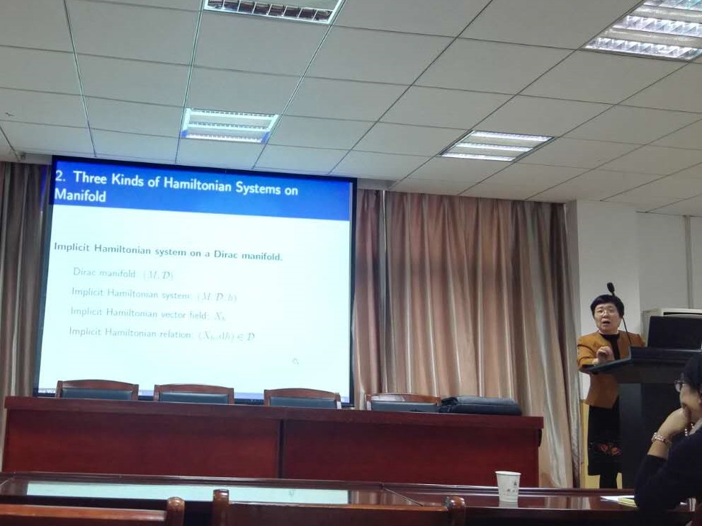 报告中,王红教授首先从力学系统中的对称力学入手,向同学们讲述了相关的基本概念,并提出了约化理论,然后重点地讲解了动力控制系统的相关问题,并详细地介绍了在流形上定义哈密尔顿系统以及如何通过映射控制哈密尔顿性的方法。最后提问环节,同学们与王红展开了激烈地讨论。