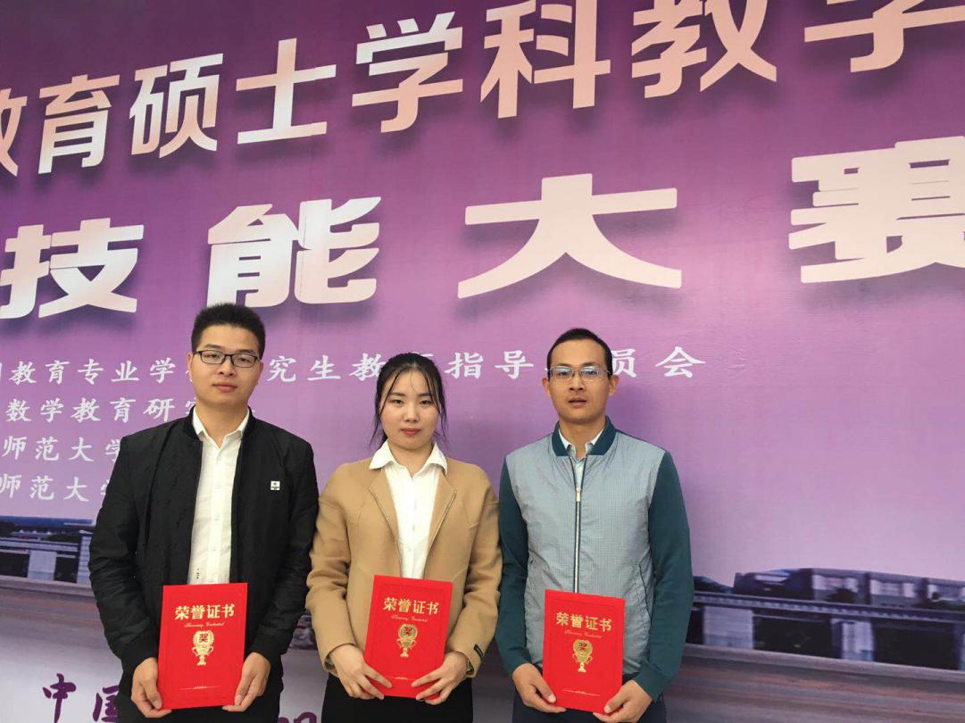 2018年9月15-17日,第三届全国全日制教育硕士学科教学(数学)专业教学技能大赛(决赛)在云南师范大学举行。公司学科教学(数学)专业2017级硕士研究生姜艳、王响、马小波同学分别斩获一等奖、二等奖、三等奖各一项,指导老师刘芸被评为“优秀指导教师”。