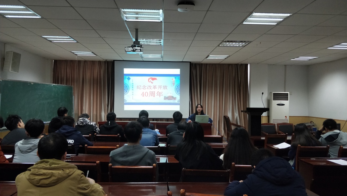 数学与应用数学1702团支部在四号教学楼209教室开展了主题为“庆祝改革开放四十周年”的团日活动,以团干介绍、即兴演讲的形式引导广大青年同学深刻领会改革开放四十周年的伟大精神,深入学习改革开放的相关知识,团支书播放改革开放相关纪录片后,由支部宣传委员详细介绍了改革开放的起因、四十周年大事记、伟大变革等;接下来随机抽取几名同学上台畅谈自己心中的改革开放以及改革开放对生活各个方面带来的变化。通过几位同学的演讲,台下聆听者感同身受,对改革开放的理解更进一步。