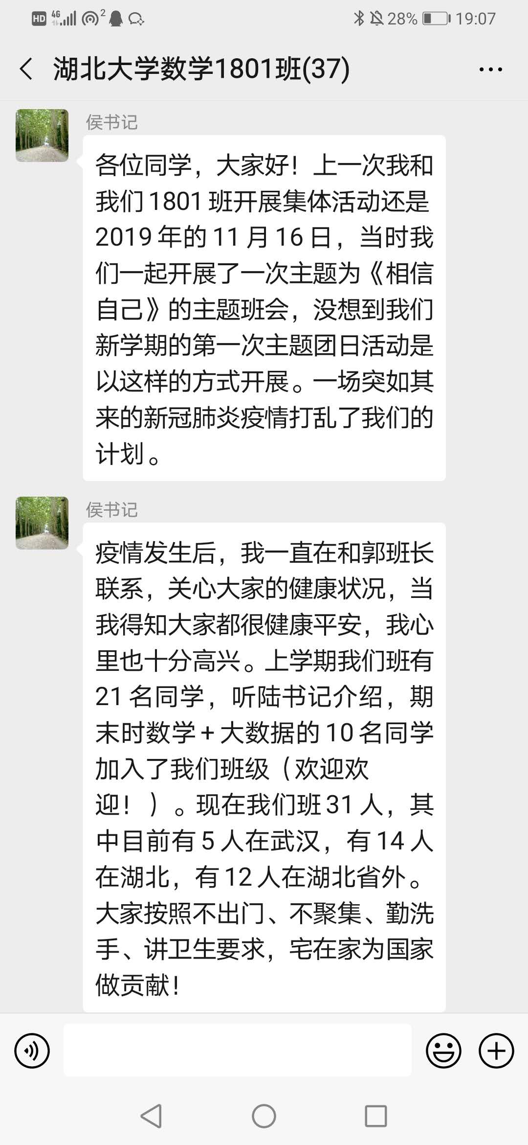 面对此次疫情,侯勇向同学们提出了几点叮嘱:一是要常怀敬畏之心。敬畏自然、敬畏生命是一种态度,是青年学子内心真正的修养。人是天地一份子、享受天地间一切,我们要敬畏生命,才会珍惜生命,活在当下,开心过好每一天,感受生命的高贵与美丽;我们要敬畏自然,热爱自然、保护环境、维护生态,爱护家园,从爱护一颗小树苗开始,相信自然就会回馈于我们;二是要常持学习之心。突如其来的疫情,打乱了我们的学习计划,改变了我们的学习方式,同学们要调整好生活节奏,调整好作息时间,制定好学习计划,利用好学习工具。班级可探索建立在线班级学堂、线上互助学习小组、专题交流园地等方式,把“空中课堂”真正利用好。除专业学习外,我们还要利用好闲暇时间,注重疫情防护知识的学习,以及关于生命、伦理、安全、心理等知识的学习,充实自身的知识和人文素养;三是要常念感恩之心。感恩是一种美德,是我们对生活的态度。我们要常念感恩之心、相助之情、相识之缘,感恩党和国家的温暖、家长的念叨、公司的挂念、师长的叮嘱、同学的问候,我们要把这些恩化为力和行,带着乐观、积极、善良、宽容、孝顺、理解、真诚、奉献去生活。阳光总在风雨后,我们要学做一株向日葵,每天面对阳光,笑出灿烂,带着满满的正能量,以寸草心,报三春晖。