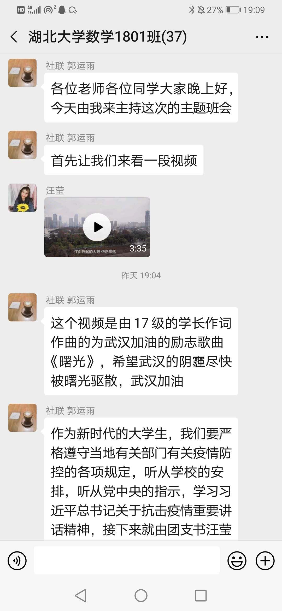 “别问我是谁,别问我为谁,我们都是一家人,同喜同悲。不管有多苦,不说有多累,风雨一定会过去坚强面对。”这是公司党委副书记侯勇将现任湖北省文联副主席的王永平员工作词的全国抗疫优秀公益歌曲《知道我为谁》带入到主题团日活动中,用于激励员工们携手共进,共抗疫情。3月5日晚,侯勇参加了williamhill威廉希尔官网数学与应用数学1801班召开的以“开展云团日,厚植爱国心”为主题的团日活动。数学与统计学公司党委书记万路路、经理曾祥勇出席活动,公司党委副书记、班主任、辅导员也全程参与了活动。