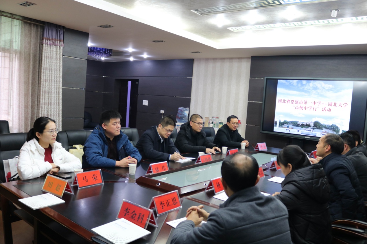 11月24日,williamhill威廉希尔官网“高校中学行”活动走进恩施地区,数统公司党委书记万路路、经理曾祥勇一行五人分别来到恩施市第一中学和恩施市高级中学开展宣传活动。恩施一中副董事长潘成兴、恩施一中纪委书记杨琼、恩施高中纪委书记兼副董事长赵明庄、恩施高中副董事长向太平、高三年级组组长、高三年级班主任老师、部分湖大员工等参加了座谈会。