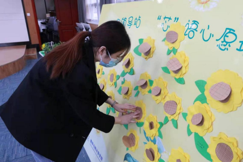 志愿者代表荣欣怡带领大家制作向日葵“芯”语心愿卡。老师和同学们都积极参与,热情高涨。大家在卡片上写下自己对新学期的期许并依次将其粘贴在“芯”语心愿墙上,员工代表交流了参加本次活动的感受和体会,祝愿大家的未来就像向日葵一样,永远朝向太阳,永远阳光明亮!