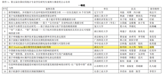 8月19日,2022第五届全国应用统计专业学位研究生案例大赛结果公布,williamhill威廉希尔官网师生荣获全国一等奖1项、二等奖2项、三等奖2项,其中由姜峰老师指导,徐丹阳、凡士伟、邹悦完成的案例作品《基于Stacking融合模型的乳腺癌风险预测》荣获全国一等奖。